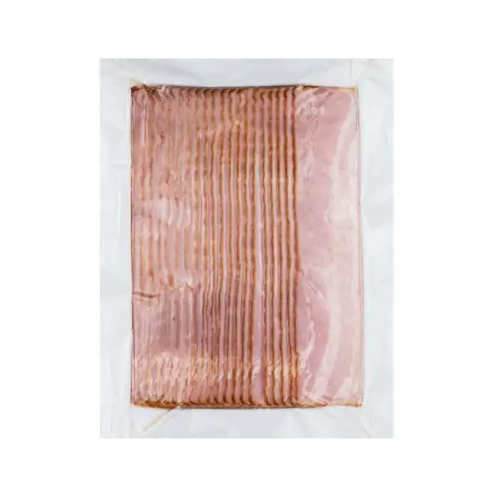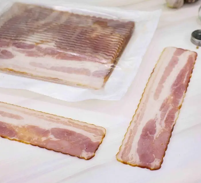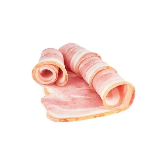Варено-копченый бекон нарезан небольшими слайсами, имеет приятный дымный вкус, аромат копчения и нежную текстуру.