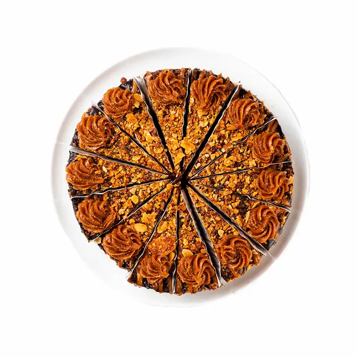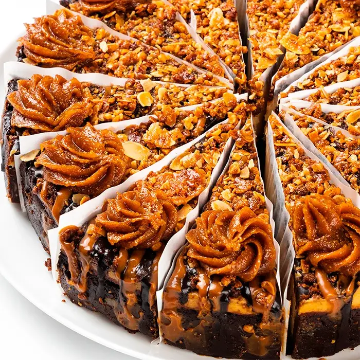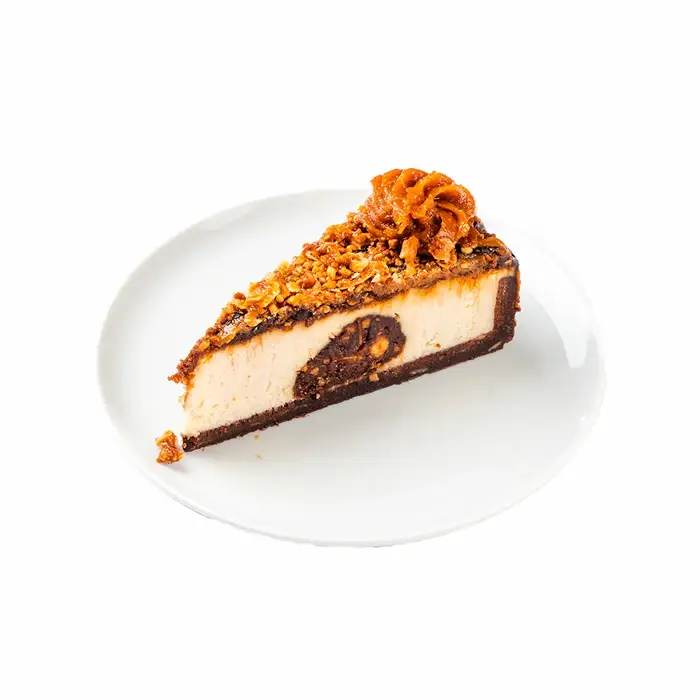 Сливочно-сырный десерт на подложке из песочного шоколадного теста и начинкой из шоколадного ганаша и карамельного кранча. Сверху чизкейк также украшен кранчем, арахисом, карамелью и шоколадным муссом.