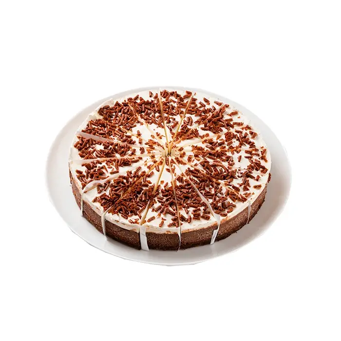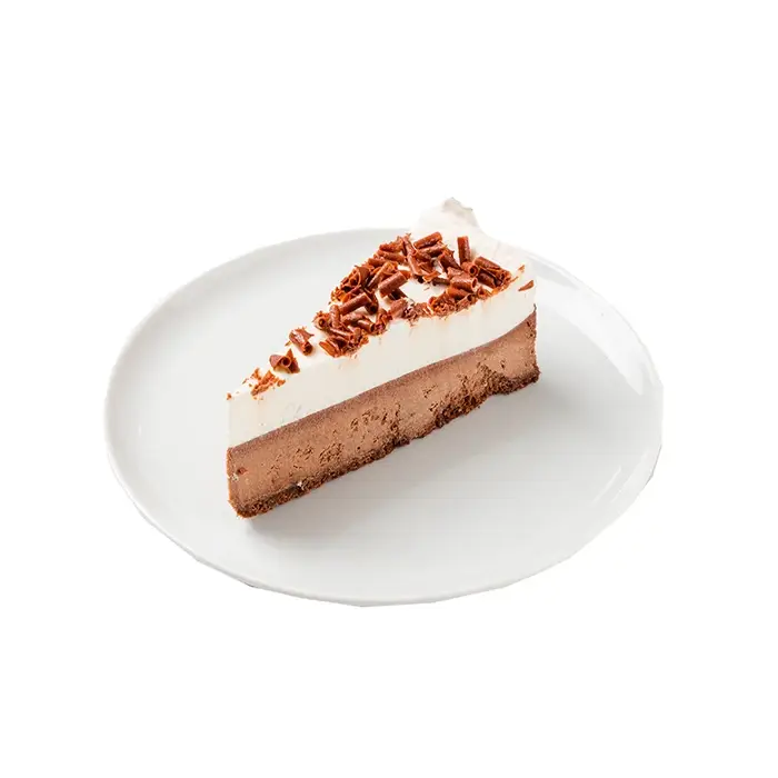 Классический чизкейк с ярким шоколадным вкусом изготовлен из натурального сливочного сыра. Воздушный слой мусса из натуральных сливок и хрустящая стружка молочного шоколада придают десерту аппетитный эффектный вид. Чизкейк уже аккуратно рарезан на порции — каждый кусок отделен бумажной прослойкой для вашего удобства.