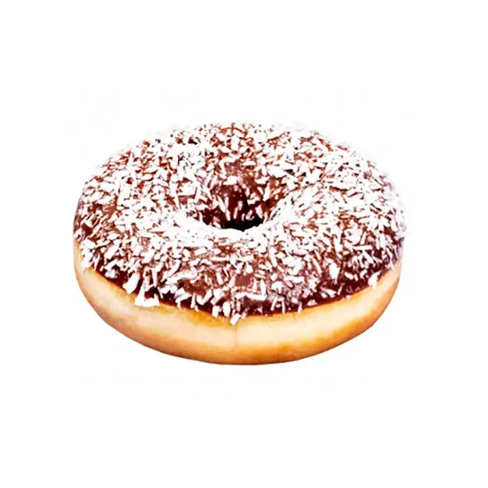 Пончик с нежной кокосовой начинкой, шоколадной глазурью с посыпкой из кокосовой стружки.