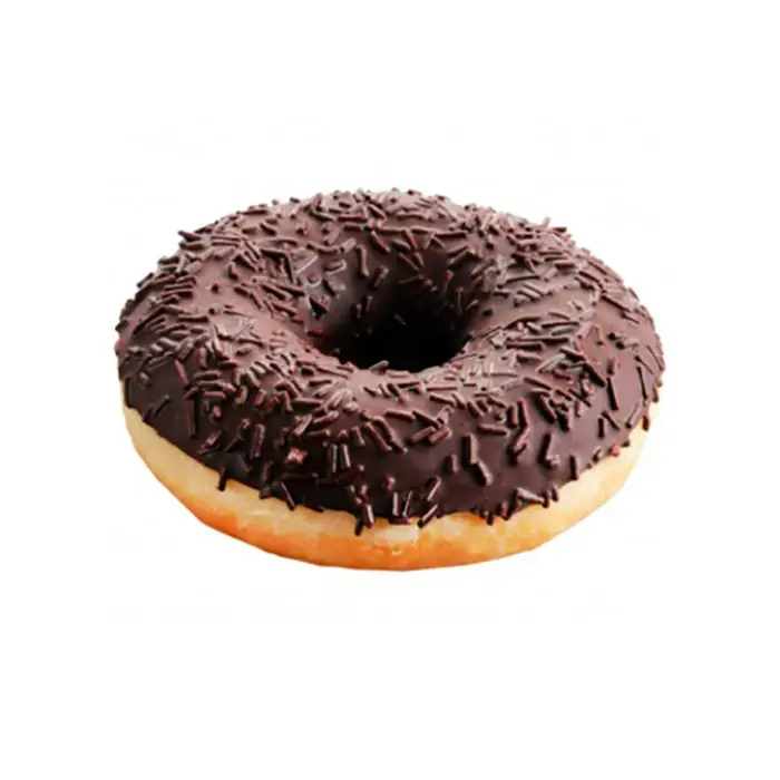 Пончик с шоколадной начинкой, глазурью и посыпкой, имеет мягкую сочную текстуру.