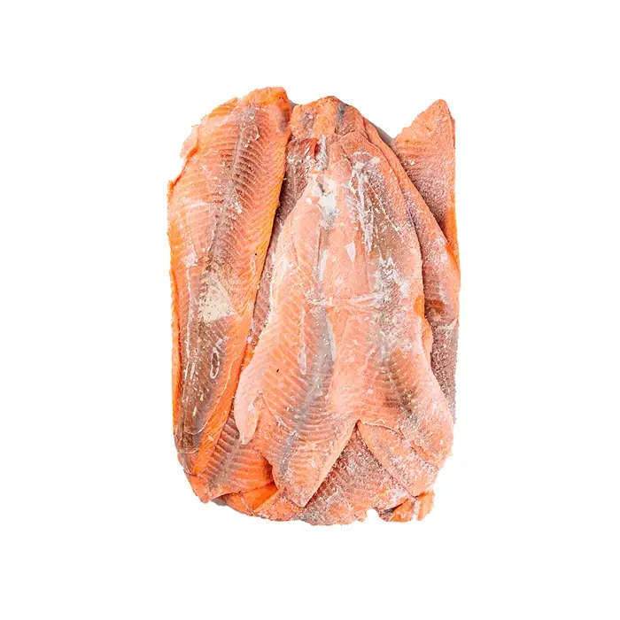 Спрессованные куски свежемороженого филе лосося (семги) разных размеров, без кожи.