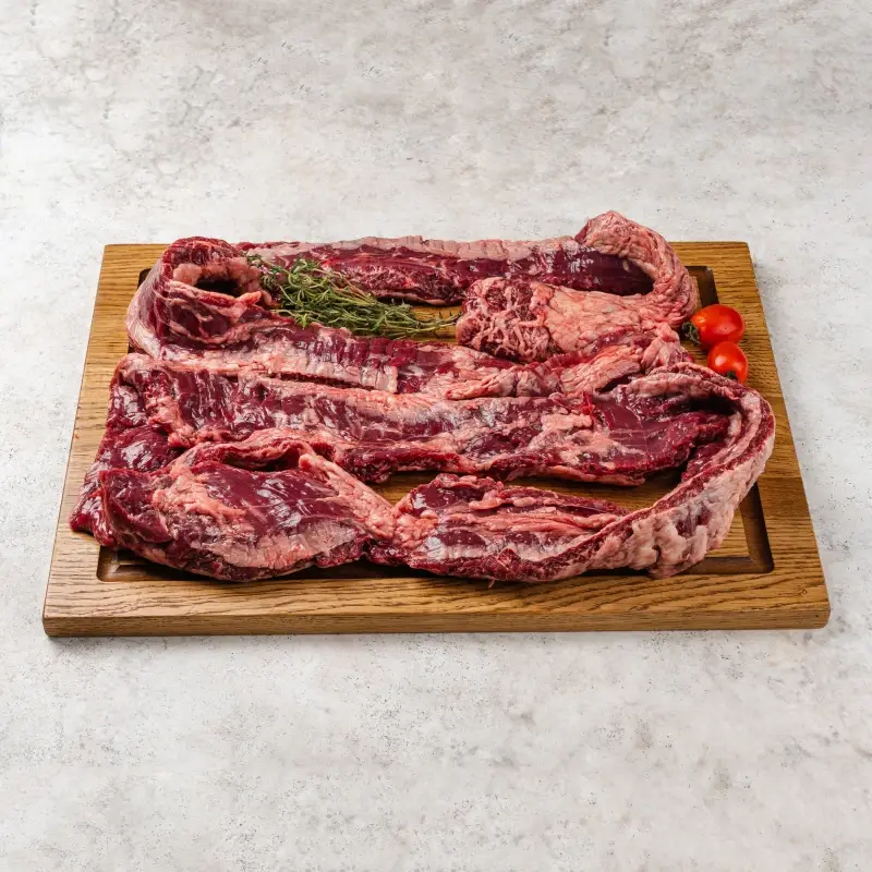 Мачете – отруб из тонкой диафрагмы животного. Второе название – outside skirt: вытянутая мышца, прикрепленная к ребрам. Нежное сочное мясо с тонким вкусом. Мачете отличается высокой мраморностью. Форма стейка напоминает легендарный латиноамериканский клинок, который сложно с чем-то спутать.