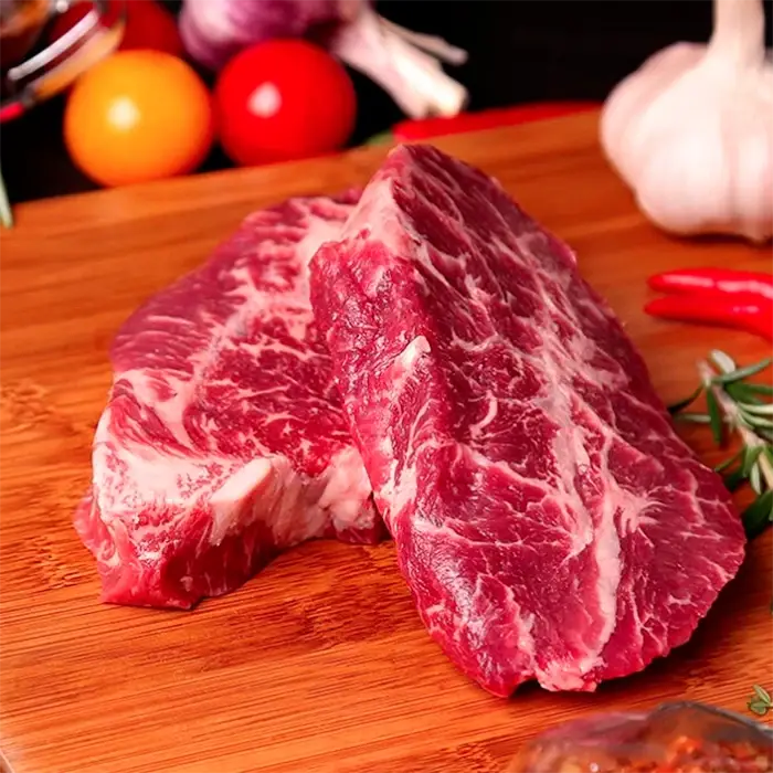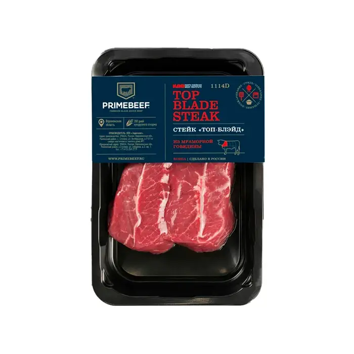 Топ Блэйд — альтернативный стейк из наружной части лопатки, не содержит костей, имеет мягкую упругую текстуру, выраженную мраморность, насыщенный говяжий вкус со сладковатыми нотами и аромат. Стейк имеет центральную жилку с лучистыми прослойками, которые в готовом виде добавляет мясу сочности, ароматности и нежности.