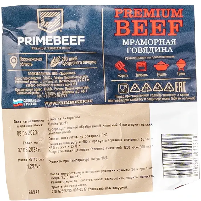 Стейк из говяжьей диафрагмы Inside Skirt 121D «Праймбиф», 1,3–2 кг