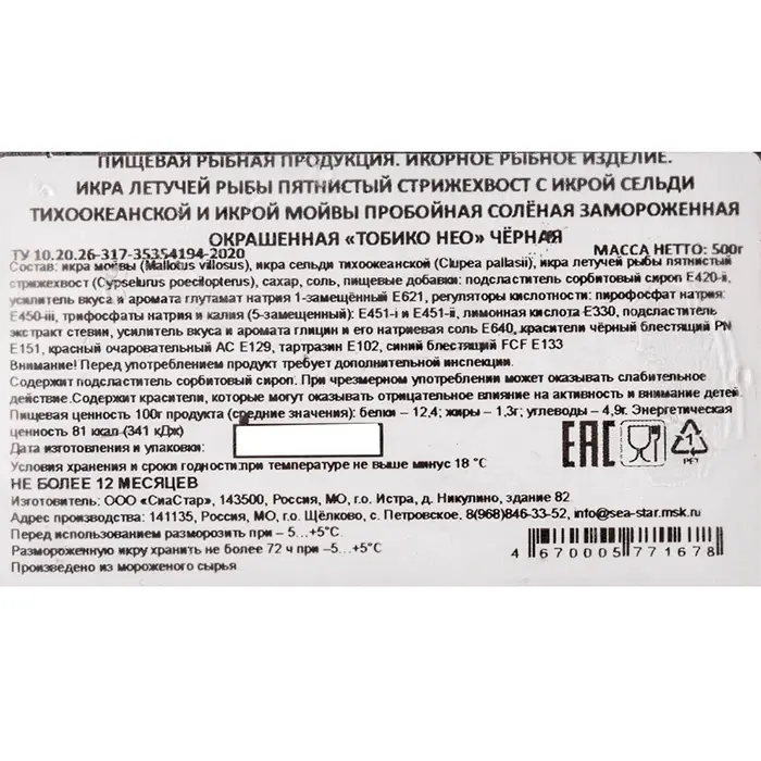 Икра летучей рыбы пятнистый стрижехвост (Cypseturus poecilopterus), сахар, соль, пищевые добавки, подсластитель: сорбитовый сироп Е420(ii), усилитель вкуса и аромата: глутамат натрия 1-замещенный Е621, регуляторы кислотности: пирофосфат натрия Е450(iii), трифосфаты натрия и калия (5-замещенный) Е451(i) и Е451(ii), лимонная кислота Е330, подсластитель: экстракт стевии, усилитель вкуса и аромата: глицин и его натриевая соль Е640, красители черный блестящий PN Е151, красный очаровательный AC Е129, тартразин Е102, синий блестящий FCF T133. Внимание! Перед употреблением продукт требует дополнительной инспекции. Содержит сахар и подсластители. Содержит подсластитель: сорбитовый сироп. При чрезмерном употреблении может оказывать слабительное действие.