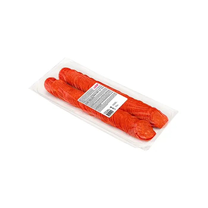 Свинина, вода, шпик, соевый белок, соль, мука горчицы, ароматизатор, пищевые волокна, мальтодекстрин, виноградный сахар, рапсовое масло, специи и их экстракты (чили, фенхель, паприка, розмарин, анис, чеснок), стартовая культура, фиксатор окраски – нитрит натрия.