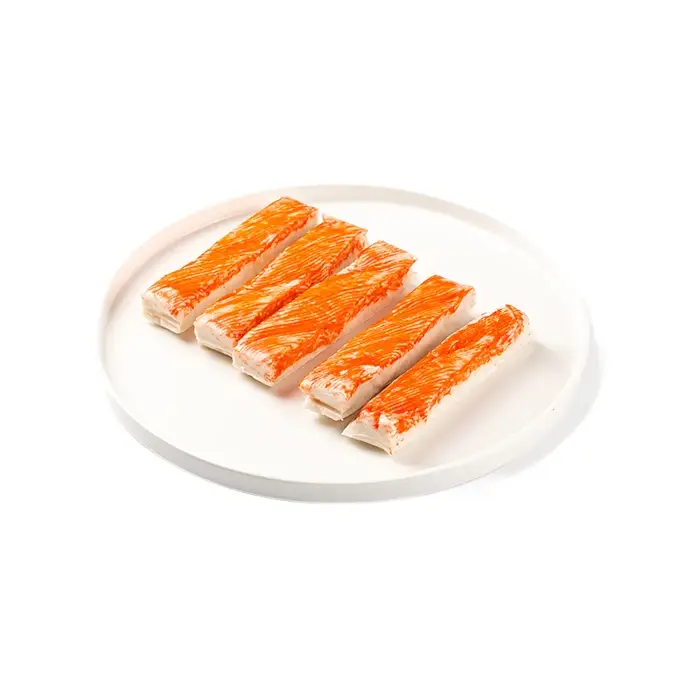 Фарш рыбный (сурими): мясо рыбы (К-джонии, Э-заурида-эсо, И-нитепер, Л-лептуракант малоголовый, КК-бычеглаз, С-пятнистый стрижехвост, СП-краснозубый спинорог, ТС-рыба-сабля, СД-большеголовая сардинелла, БГ-большой желтый горбыль, А-макруронус американский), сахар, яичный белок, агент влагоудерживающий сорбит, стабилизаторы: пирофосфат натрия, полифосфат натрия, вода питьевая, крахмал картофельный, загуститель Е1442 (модифицированный крахмал), масло растительное, соль, ароматизаторы (содержат натуральные экстракты краба, креветки, устриц, усилитель вкуса и аромата: глутамат натрия 1-замещенный), красители: диоксид титана, кармины, экстракт паприки.
