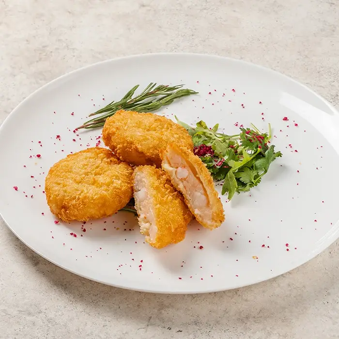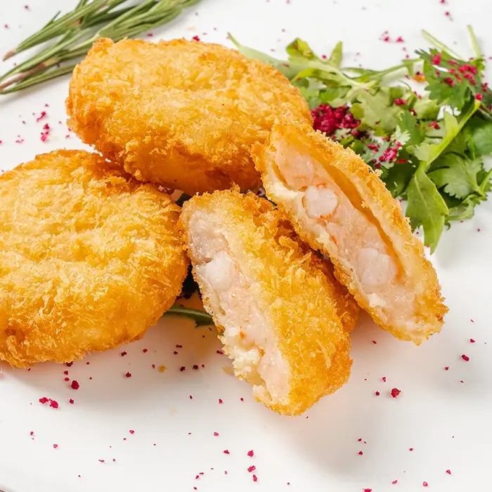 Котлеты, изготовленные из королевских креветок в хрустящей панировке по японскому рецепту.
