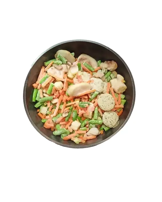 Капуста романеско, фасоль стручковая, морковь мини, шампиньоны, кукуруза мини, соус (сливочное масло, оливковое масло, вода питьевая, базилик, специи, фенхель, майоран, загуститель ксантан).