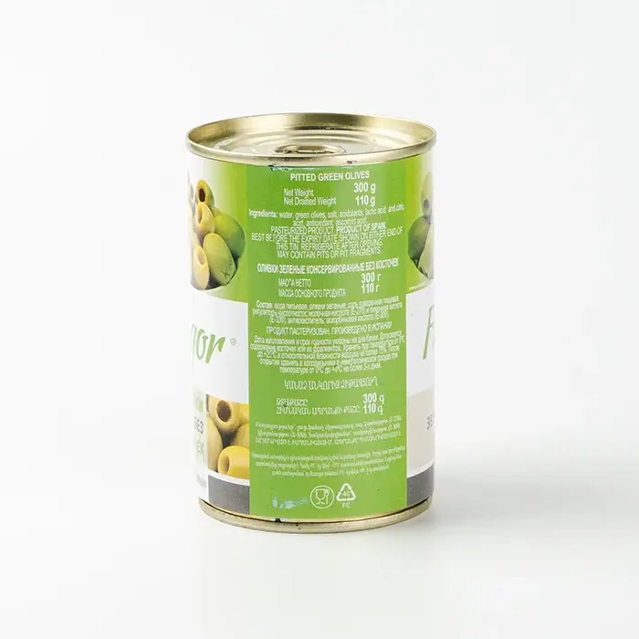 Оливки зеленые, вода питьевая, соль поваренная пищевая, регуляторы кислотности: молочная кислота (Е-270) и лимонная кислота (Е-330), антиокислитель — аскорбиновая кислота (Е-300).
