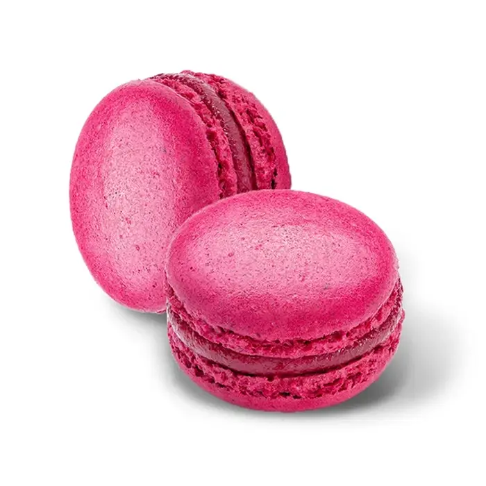 Два воздушных печенья из миндальной муки, соединенных ароматной малиновой начинкой со сбивным кремом.