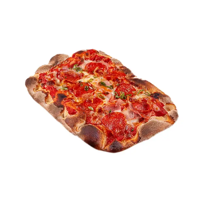 Римская Мясная сделана из итальянской муки с нежной воздушной текстурой и хрустящей корочкой. Яркое сочетание продуктов: вяленых томатов, нежной ветчины, пряной колбасы салями и пепперони — делают эту пиццу особенно пикантной.