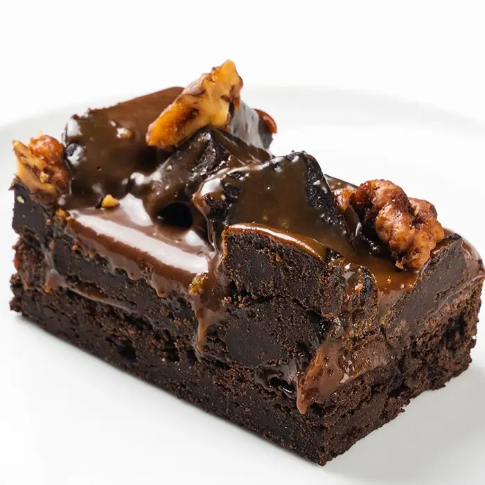 Шоколадный брауни с тянучкой из сливочной пасты, покрыт толстым слоем мягкой сливочной карамели и лесным орехом.