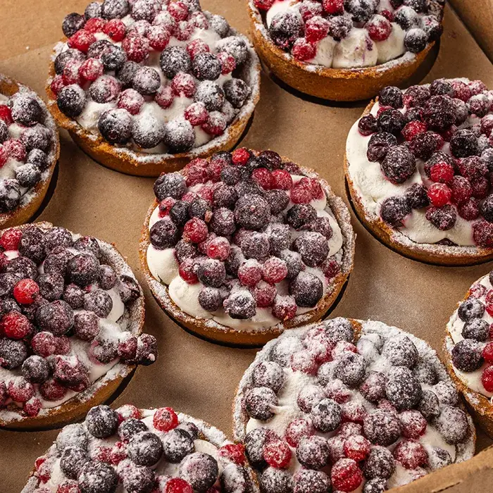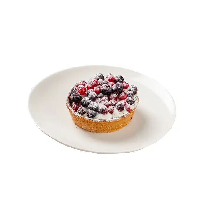Заварной крем, взбитые сливки, красная и черная смородина в корзиночке из песочного теста.