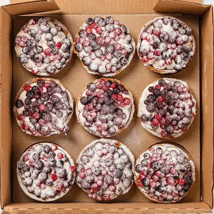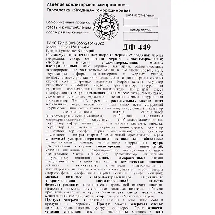 Малина замороженная, мука пшеничная в/с, голубика замороженная, шоколад белый, молоко коровье, сахар, крем на растительных маслах, маргарин, малина грис замороженная, меланж пастеризованный (яйцо куриное), сливки из коровьего молока, желток яичный пастеризованный, мука миндальная, пудра сахарная "нетающая", загуститель "сафтия", крахмал нативный, смесь модифицированных крахмалов, стабилизатор ксантовая камедь, лимонная приправа. Продукт содержит аллергены: глютен, молокопродукты, яйцепродукты, соевый лецитин. Может содержать следы рыбы, арахиса, орехов.