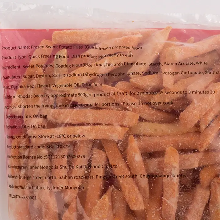 (Переведено с английского языка: Sweet Potatoes, Coating Flour (Rice Flour, Distarch Phosphate, Starch Acetate, White Granulated Sugar, Dextrin, Salt, Disodium Dihydrogen Pyrophosphate, Sodium Hydrogen Carbonate, Xanthan Gum, Paprika Red, Flavor), Vegetable Oil, Citric Acid).