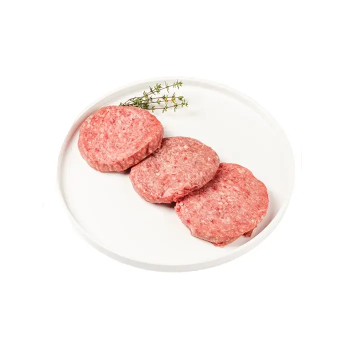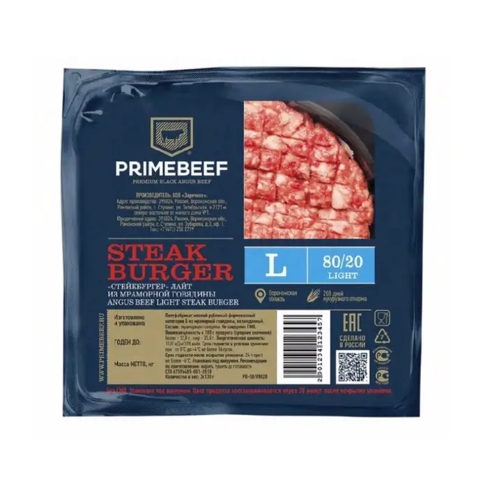 Мясной рубленый полуфабрикат, изготовленный из мраморной говядины. Содержит исключительно фарш в чистом виде, без дополнительных добавок или специй, в соотношении мяса и жировых прослоек 80/20.
