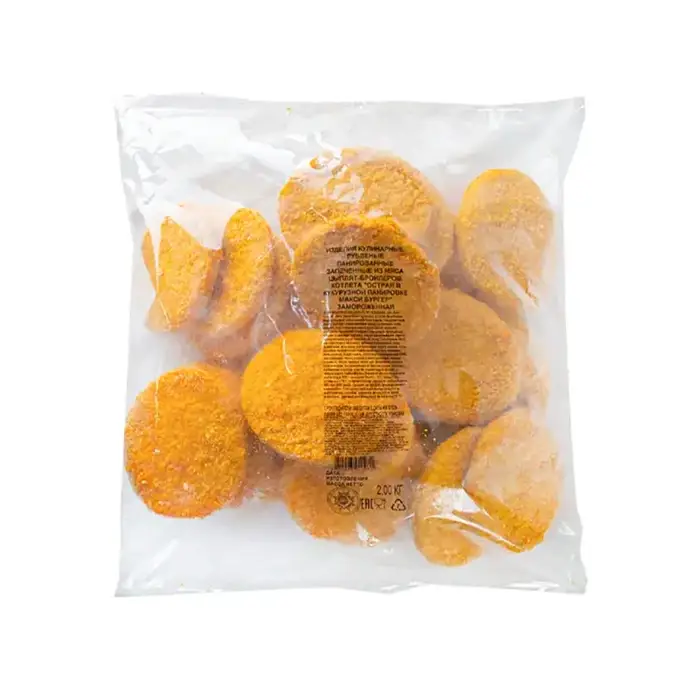 Котлета с нежным островатым вкусом в хрустящей кукурузной панировке, которая остается хрустящей при разогреве и сохраняет сочность мяса.