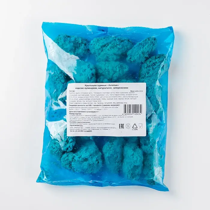 Куриное крыло (плечевая часть / плечевая и локтевая части), мука пшеничная, крахмал: кукурузный, картофельный, глютен пшеничный, соль, масло подсолнечное, антиокислители Е319, Е330; разрыхлители: Е450i, E500ii; регулятор кислотности Е451i, агенты желирующие: Е407а, Е508; ароматизаторы натуральные, перец: красный чили, черный, белый; экстракт дрожжей, чеснок, лук, экстракт перца чили