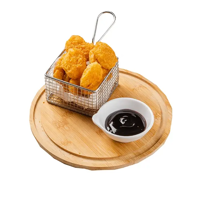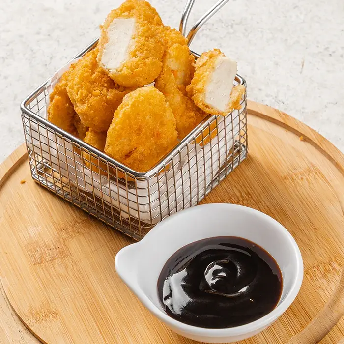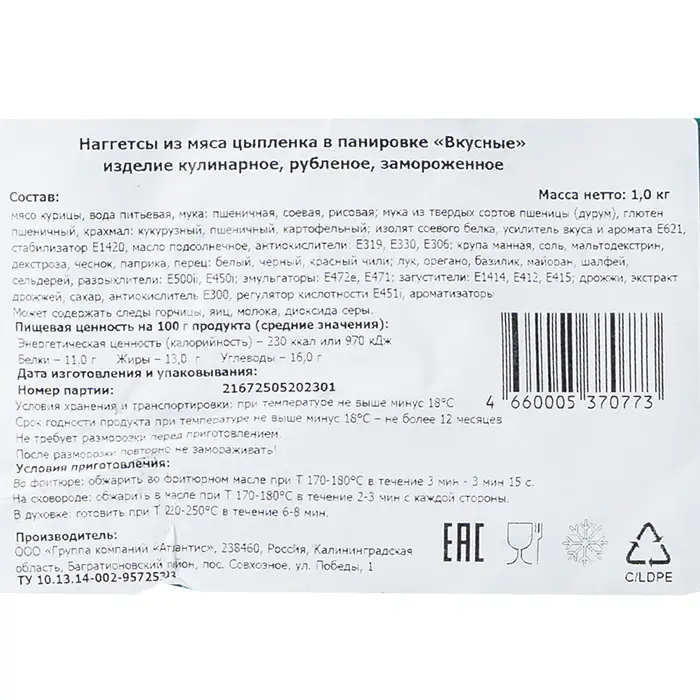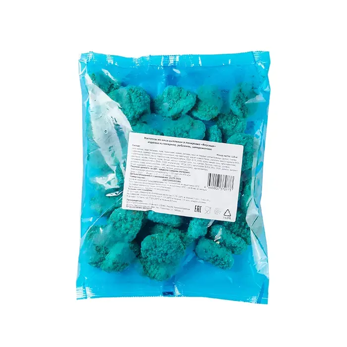 Наггетсы из сочного нежного цыпленка в хрустящей панировке с добавлением специй в экономичной упаковке. Они аппетитно смотрятся на столе, употребляются как самостоятельная закуска и вместе с гарниром.