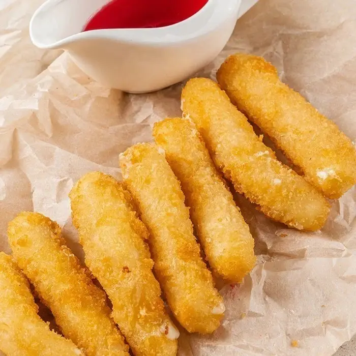 Сырные палочки в панировке — хрустящие снаружи, мягкие и тянущиеся внутри, имеют нежный сырный вкус, не требуют размораживания.
