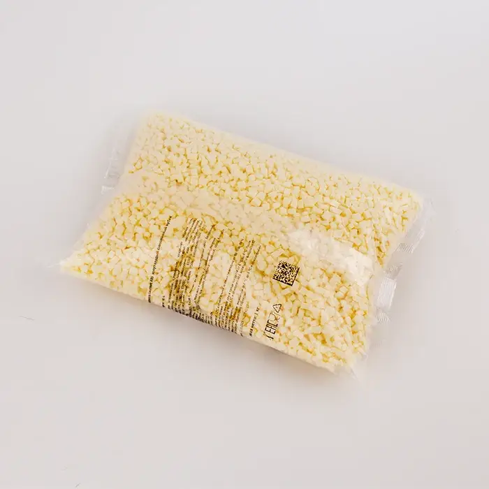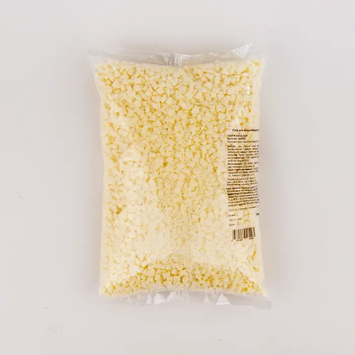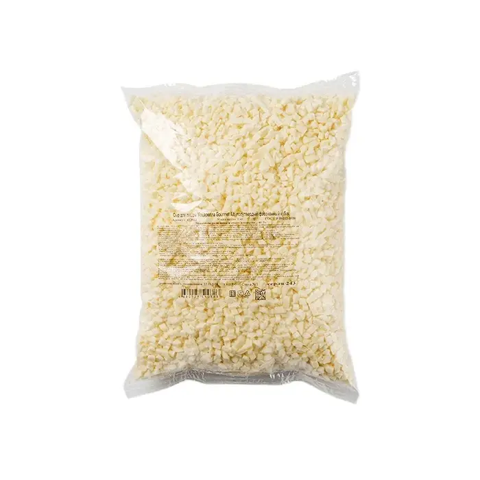 Полутвердый сыр Моцарелла обладает упругой, слоистой и волокнистой структурой, нежным сливочным вкусом с мягкой солоноватостью и чистым молочным ароматом. При запекании равномерно и быстро плавится, хорошо тянется и образует золотистую корочку. Сыр порезан на кубики для упрощения взвешивания и порционирования.