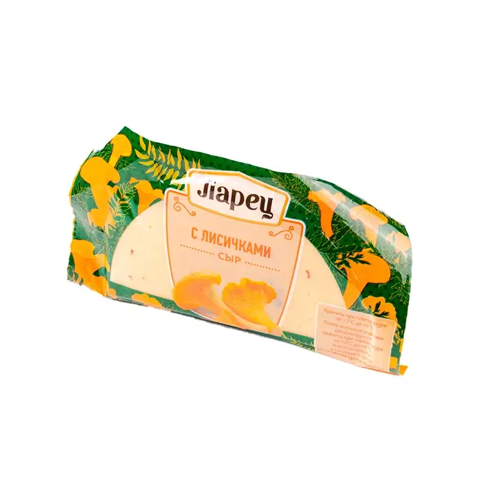 Полутвердый сыр светло-желтого цвета имеет нежный вкус, легкий грибной аромат, пластичную консистенцию, равномерно распределенные маленькие глазки и вкрапления лисичек. Сыр поддается плавлению.