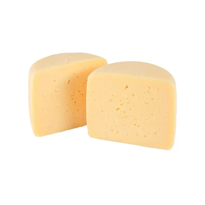 Полутвердый сыр жирностью 50% имеет вкус томленого молока, нежный ореховый, карамельный привкус и приятный кремовый оттенок, эластичную текстуру, рисунок из мелких и средних глазков, форму круга.