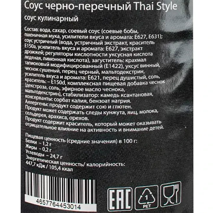 Вода, сахар, соевый соус (соевые бобы, пшеничная мука, усилители вкуса и аромата: Е627, Е6З1); соус устричный (вода, устричный экстракт, краситель Е150а, усилитель вкуса и аромата: Еб27, экстракт дрожжей; регуляторы кислотности — уксусная кислота ледяная, лимонная кислота), загуститель: крахмал тапиоковый модифицированный (Е1422), уксус винный, чеснок сушеный, перец черный, глутамат натрия, мальтодекстрин усилитель вкуса и аромата: Еб21, перец душистый, соль, краситель: — Е150д, комплексная пищевая добавка чеснок (декстроза, соль, эфирное масло чеснока, мальтодекстрин), стабилизатор: камедь ксантановая, консерванты: сорбат калия, бензоат натрия.