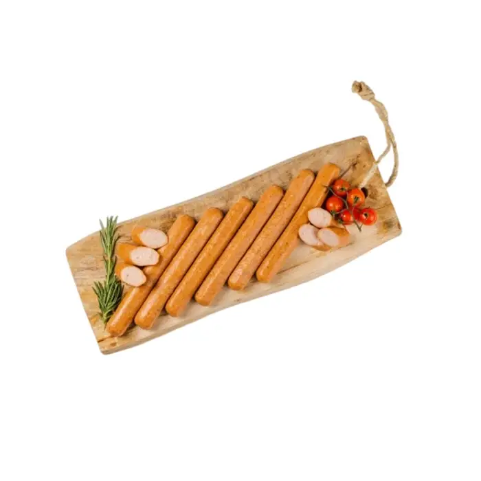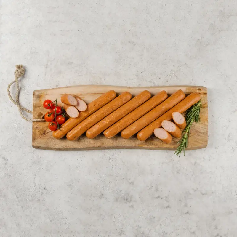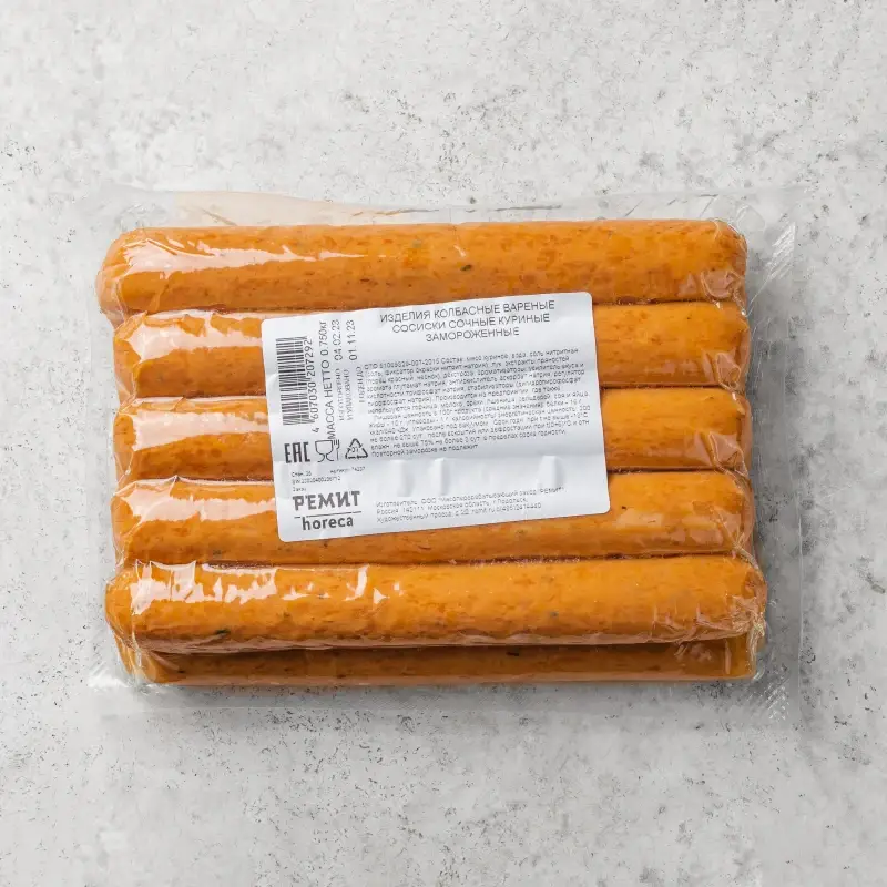Сочные куриные сосиски с плотной и нежной консистенцией с классическим вкусом с ароматом красного перца и чеснока.