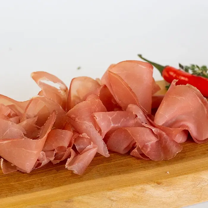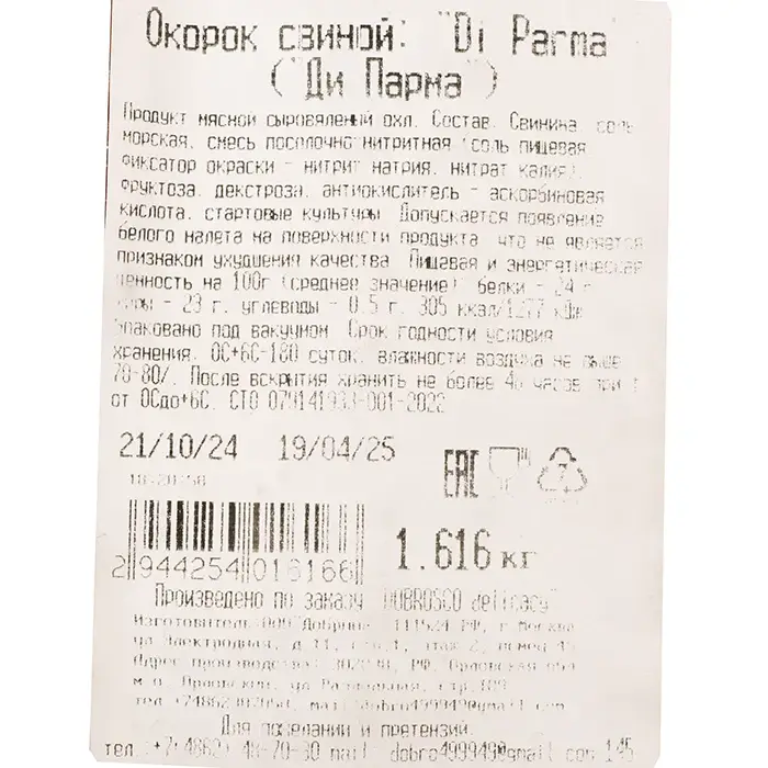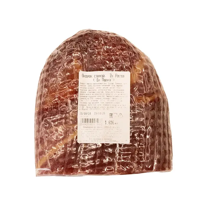 Окорок Di Parma — сыровяленый деликатес из свинины, изготавливаемый в соответствие с итальянскими традициями. Парма имеет нежный розовый цвет, гладкую поверхность, плотную, упругую текстуру, мягкий сладковато-соленый вкус с легкими ореховыми нотами и насыщенный и характерный аромат с мясными и пикантными оттенками.