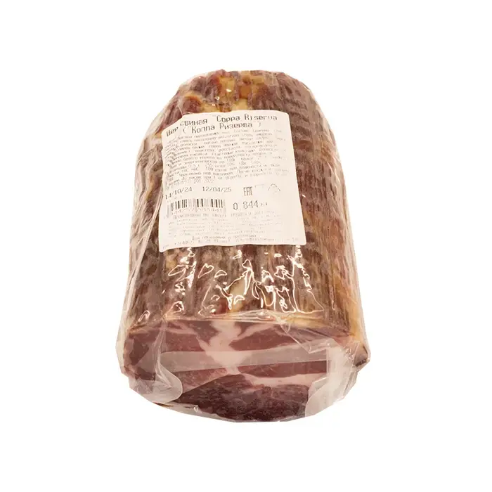 Шея Coppa Riserva — сыровяленый деликатес из свинины, изготавливаемый в соответствие с итальянскими традициями. Коппа содержит тонкие жировые прослойки, которые придают продукту сочность и мягкость. Шея имеет плотную, упругую текстуру, пряный, слегка сладковатый вкус с тонкими оттенками перца и ароматных трав.