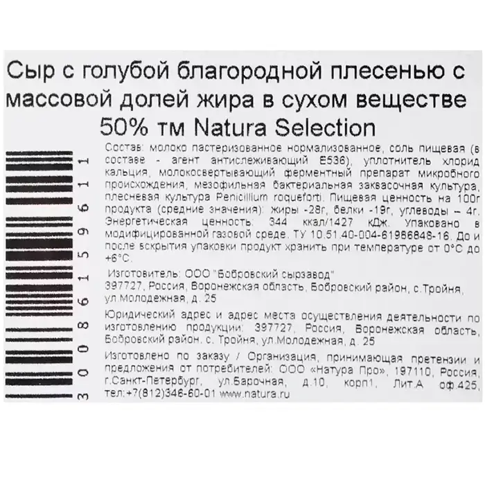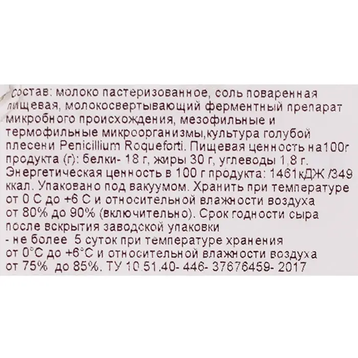 Молоко пастеризованное нормализованное, соль пищевая (в составе — агент антислеживающий Е536), уплотнитель хлорид кальция, молокосвертывающий ферментный препарат микробного + происхождения, мезофильная бактериальная заквасочная культура, плесневая культура Penicillium roqueforti.