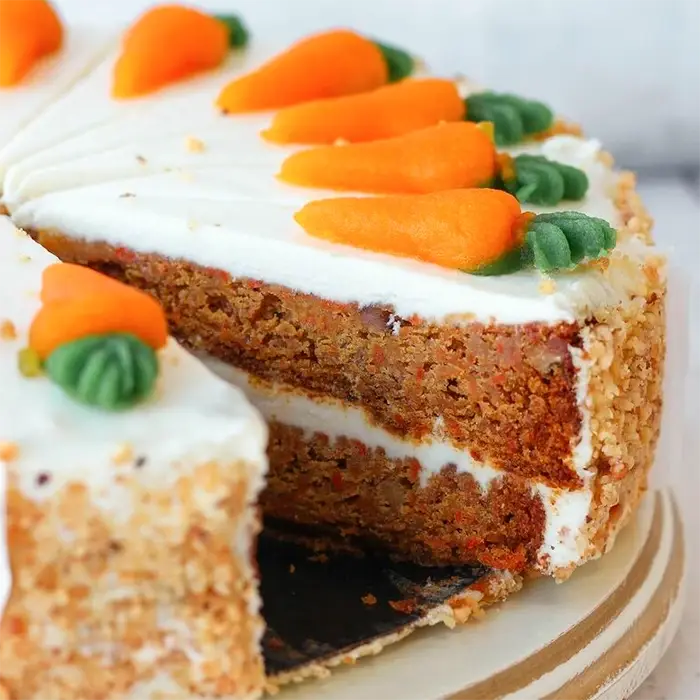Десерт из мягких коржей с добавлением моркови, ананаса, грецкого ореха, изюма пропитаны сливочным кремом и украшены декорированными кремовыми морковками.