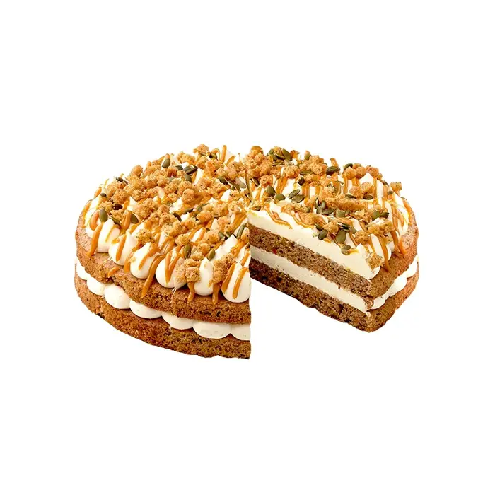 Американский классический торт сделан из пышных морковных коржей, воздушного и нежного сливочного сырного крема. Декорирован карамелью, тыквенными семечками и кубиками морковного бисквита.