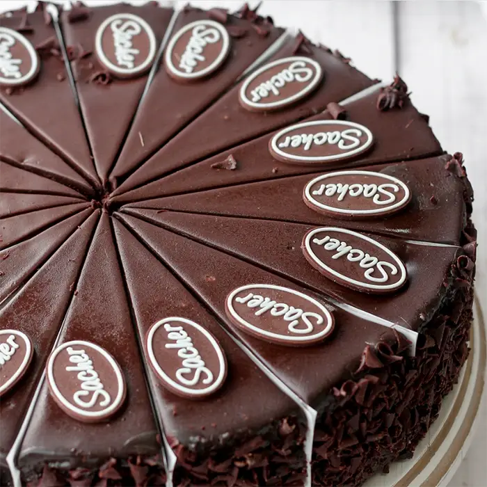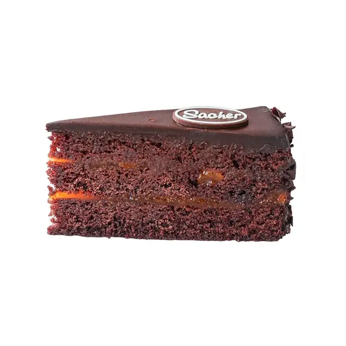 Хорошо пропитанный десерт с абрикосовым джемом и шоколадной глазурью сделан по традиционной австрийской рецептуре имеет яркий шоколадный аромат.