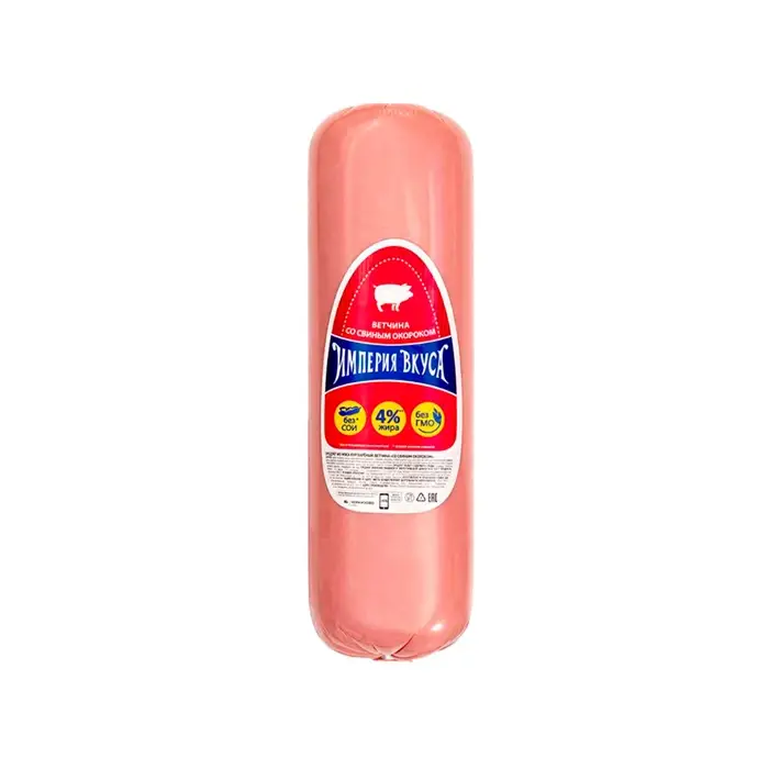 Ветчина со свиным окороком в форме цилиндра имеет в меру соленый, пикантный, мясной вкус, нежную текстуру, привлекательный внешний вид, розовый цвет.