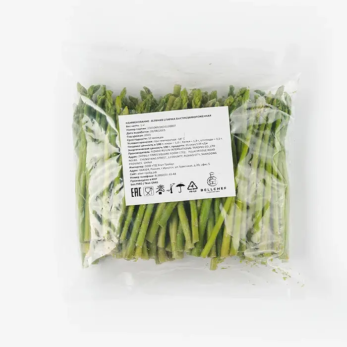 Свежая, хрустящая зеленая спаржа со знаменитым тонким травянистым ароматом и сложным, богатым вкусом. Заморожена с применением технологии шокоовй заморозки.